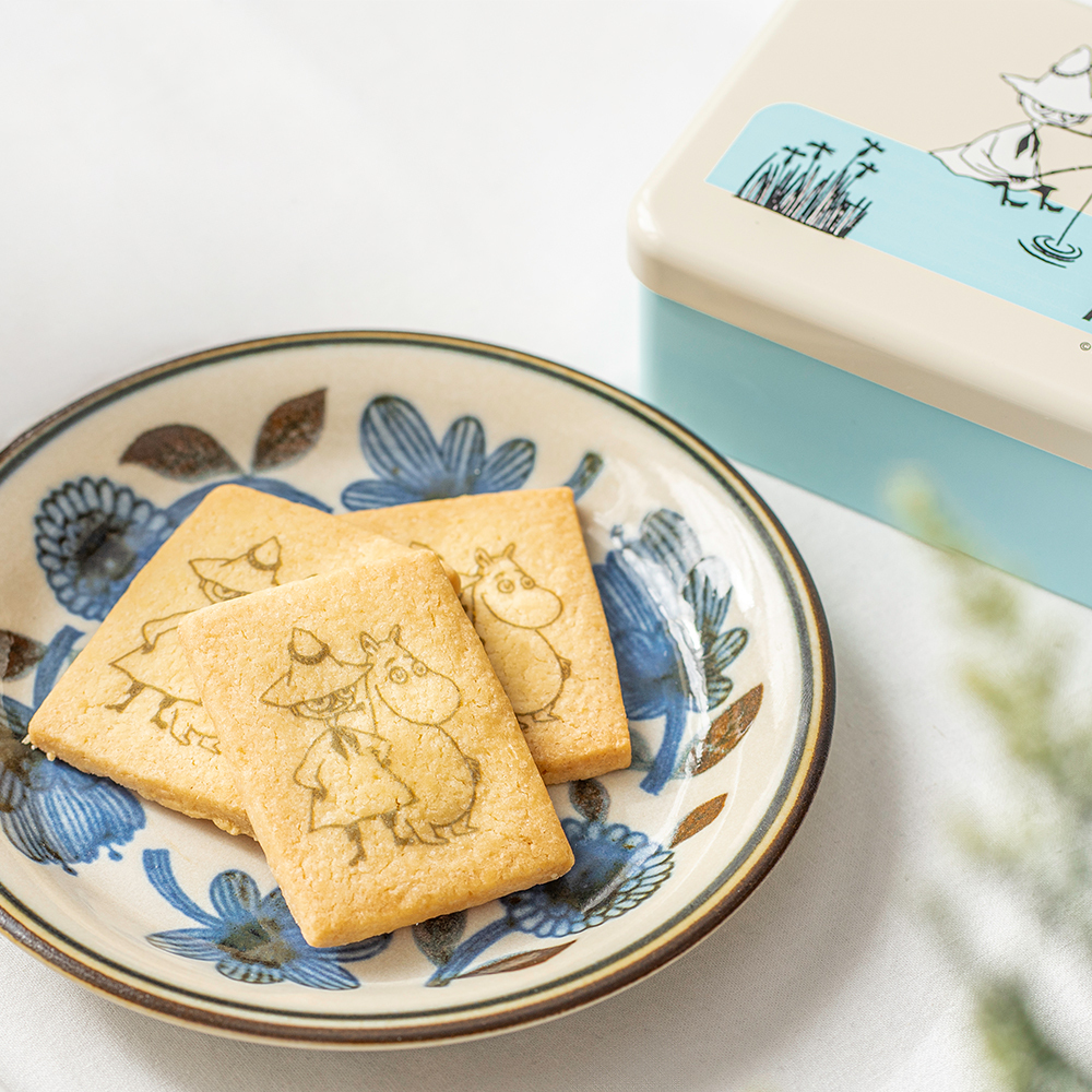 自分ひとりの時間を大切にするスナフキンとムーミンが描かれた、落ち着いた雰囲気のデザイン入りバタークッキーです。
