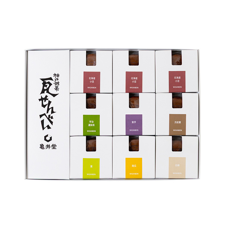 和三盆瓦まんじゅう:9個入り(北海道小豆:3個、宇治濃抹茶:1個、白練:1個、鶯:1個、渋皮栗:1個、紫芋:1個、南瓜:1個) 小瓦せんべい:6枚 |